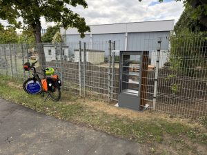 Meine letzte Station in Köln war die Freie Naturschule in Sürth. Ganz neu steht dort ein BOKX® 05 Bücherschrank! Ungewöhnlich platziert, steht er im Zaun eingebaut und verbindet den Außenraum mit dem Schulgelände. Die Bücher verbinden die Menschen außerhalb der Schule mit den Schüler:innen und Lehrer:innen in der Schule. Zur Sicherheit, damit niemand durch den Schrank klettert, wird der Schrank mit einem Schloss ausgestattet.